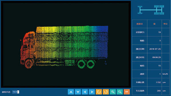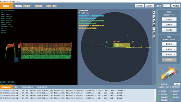 The LiDAR system possesses the capability to capture and gather intricate traffic information survey data, encompassing details such as the specific vehicle type, its contour, the overall traffic volume, the precise time headway between vehicles, the percentage of cars following closely, the distance between vehicles' fronts, the average of such distances, and the time occupancy rate. All this data is then transmitted to the data service center via a predefined communication protocol, ensuring the seamless integration and analysis of vital traffic metrics for enhanced traffic management, planning, and optimization efforts.